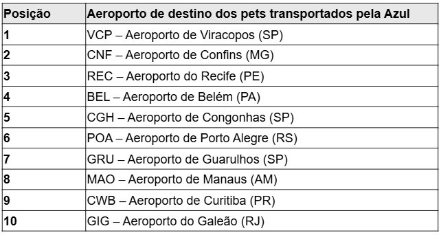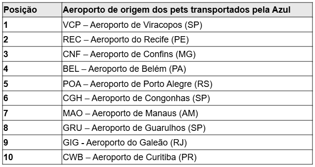 O estudo mostrou a relevância do serviço realizado pela Azul e destacou o Aeroporto de Viracopos, em Campinas (SP), principal hub da Azul. O aeródromo ficou em primeiro lugar absoluto entre os que mais embarcaram animais de estimação ao longo deste ano. Os aeroportos do Recife (PE), Confins (MG), Belém (PA) e Porto Alegre (RS) fecharam o top 5, nessa ordem.