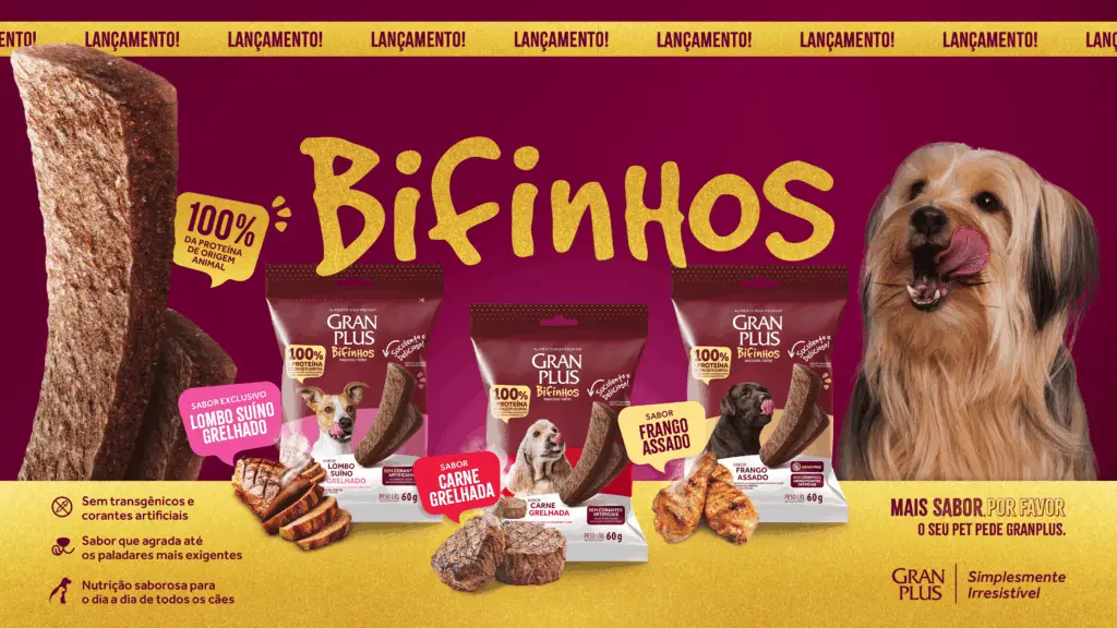 Disponíveis em embalagens de 60g, os Bifinhos GranPlus chegam em três sabores: lombo suíno grelhado, carne grelhada e frango assado. Os produtos contam com 33% de proteína, não têm corantes artificiais ou adição de ingredientes transgênicos, como a soja, reforçando o compromisso da marca com uma alimentação saborosa e equilibrada para o dia a dia dos cães.