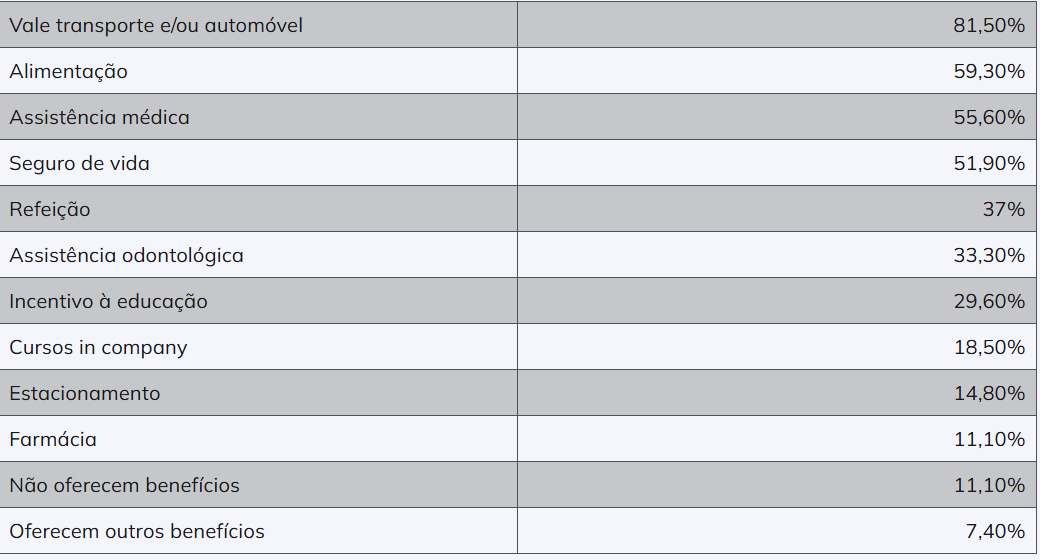 O modelo formal contribui para estabilidade e retenção de talentos, mas amplia o peso da estrutura fixa no resultado operacional. Além disso, a maioria das empresas oferece benefícios.